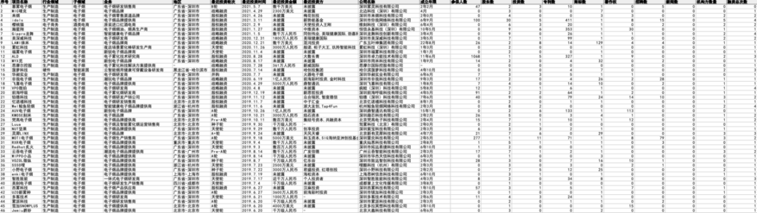 统计维度包括被统计企业的:成立年限(截至2021.5.7,数据已换算成月)、公司规模(参保人数)、股东情况、专利/商标/著作权情况、获得投资的情况(机构数量与融资轮次数量/阶段)、总融资额、品牌影响力、舆情数据等。