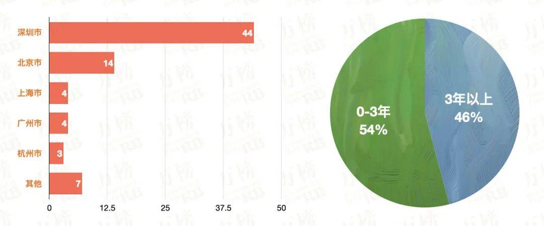 由于电子烟行业的总部所在城市相对集中,与以往榜单不同,此维度我们直接以“市”作为分析指标,可以看到,电子烟企业所在城市绝大部分在深圳。所统计的76家电子烟企业中,44家的总部都在广东省深圳市。更确切地说,大部分电子烟企业设在深圳,是因为电子烟工厂主要集中在深圳宝安区的沙井和西乡这两个街道。经统计,中国54%的电子烟企业都是在近3年内成立的,但电子烟行业早已在中国存在了10余年。
