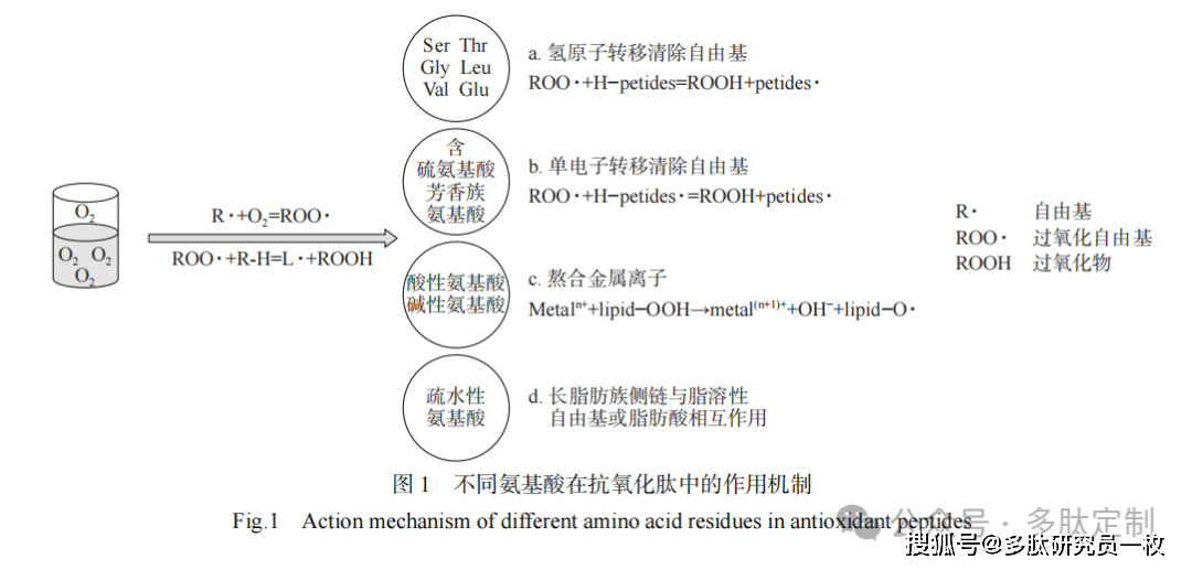 抗氧化肽的活性归因于其立体空间结构,一级结构中氨基酸基团、酸碱性、亲疏水性、相互作用和二级结构对抗氧化肽活性产生重要影响。His、Arg、Lys、Glu和Asp作为极性带电氨基酸可以吸引带有异性电荷的自由基和金属离子,赋予肽抗氧化能力。含硫氨基酸的巯基,芳香族氨基酸的苯环、酚羟基、吲哚基团,部分疏水性氨基酸的长脂肪族侧链,部分中性氨基酸的羟基,酸性氨基酸和碱性氨基酸的羧基这些官能团都对抗氧化肽的活性有显著影响。具体来说,Gly,Asp、Glu、Leu、Val、Cys、Ser、Thr、Arg、Tyr和Glu清除自由基的作用机制是提供氢原子。Ile、Leu、Ala、Lys、Val和Met等疏水性氨基酸的抗氧化作用机制主要是清除脂类自由基和增强水油界面的溶解度,延缓脂质氧化。Met、Tyr、Trp、His、Phe、Pro和Trp的作用机制是通过提供电子稳定自由基。
