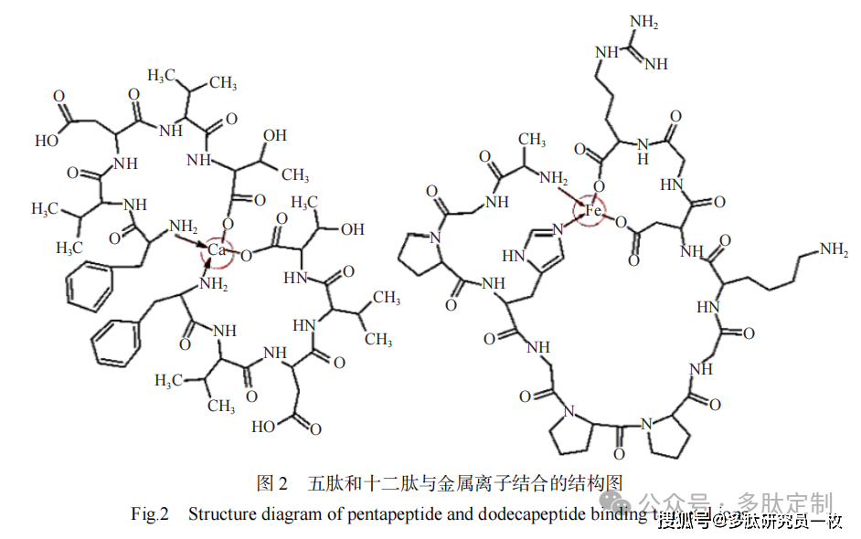 氨基酸侧链的基团与金属离子螯合活性有关,带正电的碱性氨基酸侧链上的羧基失去氧原子与金属离子形成络合物[60],带负电的酸性氨基酸侧链上的氨基失去氮原子,氮原子未共享的电子对与金属离子结合,酸性氨基酸螯合Fe2+的还原方式与抗坏血酸类似[61],生成具有三齿结构的稳定铁螯合物[73]。碱性氨基酸的羧基、Asp的游离γ-羧基和Glu的游离δ-羧基与金属离子结合[73],His的咪唑环、Cys的巯基、Trp的吲哚基和Thr的羟基[1]以及Ser的羟基[74]可以提供额外的金属离子结合位点。