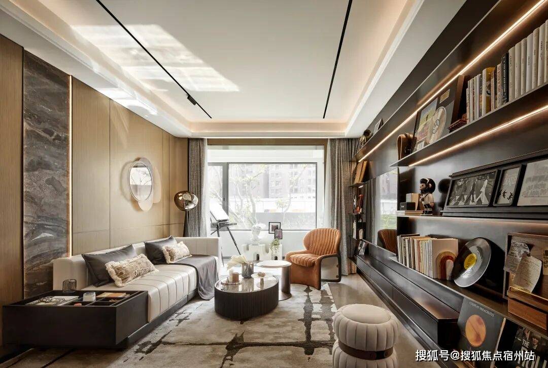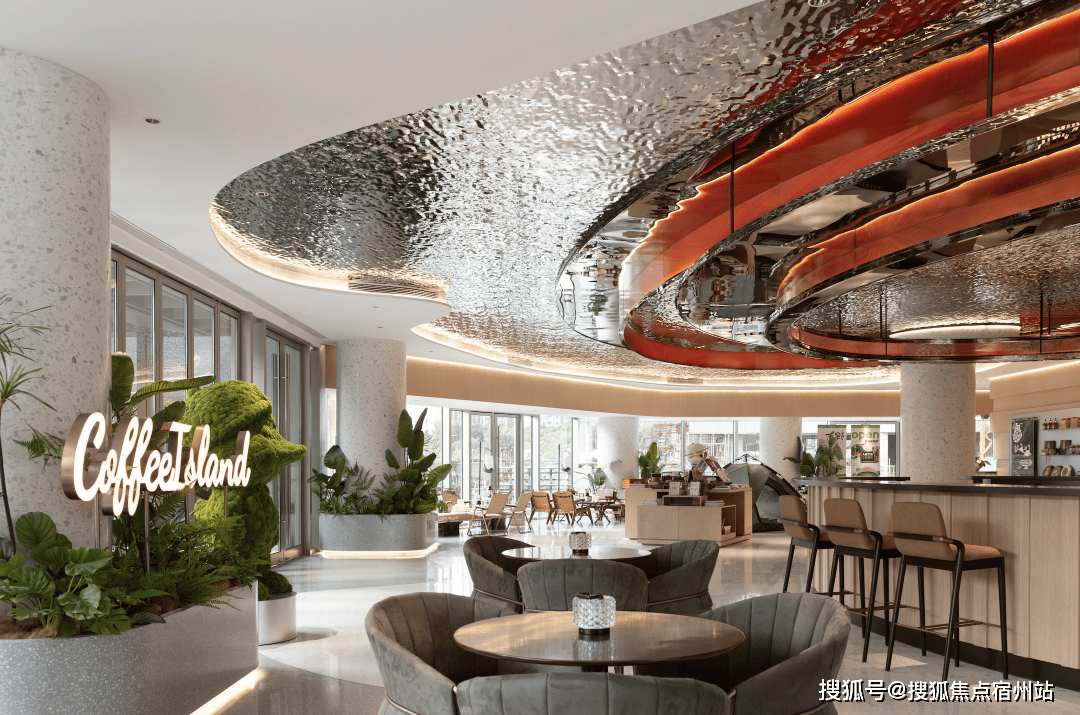 搭配银色水波纹天花,宛如时间的涟漪,与绿植相互映衬,为空间增添了灵动感和节奏感,营造出充满未来感的艺术氛围。